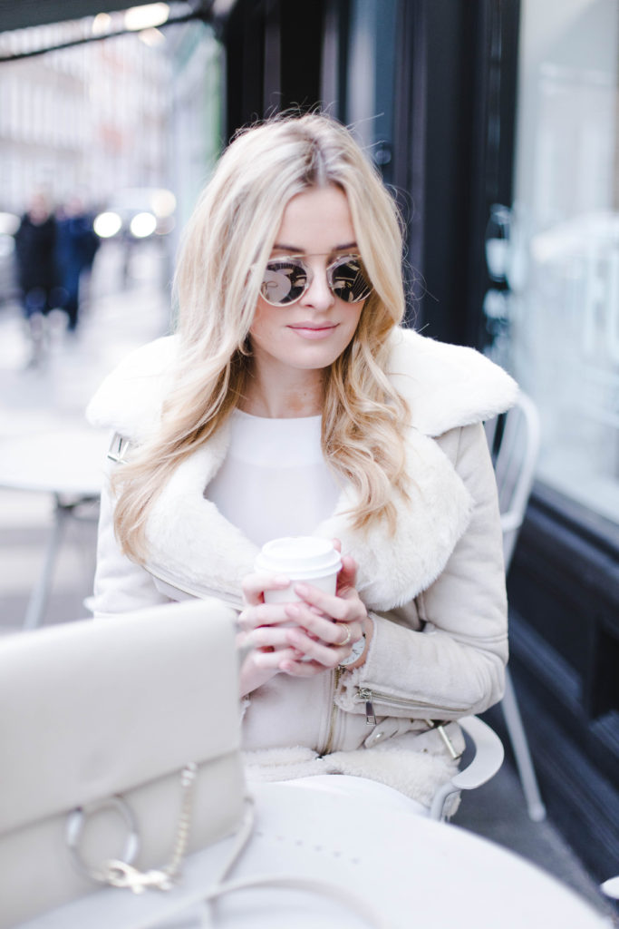I shot this look before work during the week, I’m slowly moving away from the January uniform (all black everything) into my favourite Spring/ Summer colours. It’s still absolutely freezing though, so jackets are absolutely still needed. I got this gorgeous faux fur aviator jacket from River Island during the week and I love it. It will be perfect to match with lighter colours as we move into Spring. I’m wearing a Pierre Darre bag from Yoox.com, my Dior ‘So Real’ sunglasses and my Cluse Watch as well.